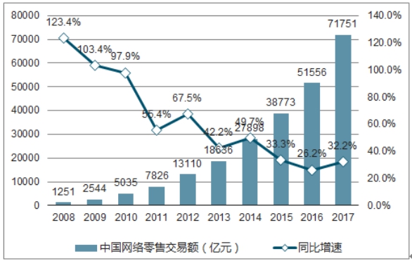 中国是全球最大网络零售市场,拥有5.33亿网络购物用户。中国网民数量列全球首位,2017年达到7.72亿,网民的网购使用率达到69.1%。网络零售额71751亿元(约合11288亿美元),其中,实物商品网络零售额54806亿元,增长28.0%,占社会消费品零售总额的比重达到15%。