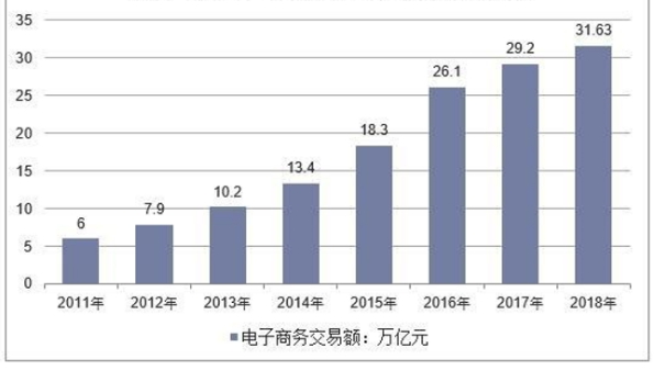 自2011年以来,我国电子商务市场交易额稳定增长。其中,2017年电子商务交易金额为29.16万亿元,2018年交易额为31.63万亿元,同比增长8.3%。