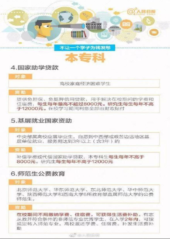 目前实行的新资助政策是包括国家奖学金、国家励志奖学金、国家助学金、国家助学贷款和勤工助学等多种方式的资助体系,既帮助家庭经济困难学生解困,又激励优秀学生成才,还鼓励学生学习国家最需要的专业或接受职业教育。对国家最需要的农林水地矿油核医等专业的毕业生,志愿到中西部地区县及县以下基层单位工作的,国家还实行学费返还或国家助学贷款代偿政策,这样就把青年学生个人的发展和国家的需要紧密地联系到了一起。