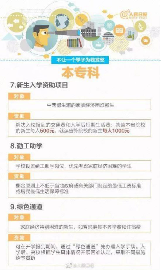 新生入学资助项目:中西部生源的家庭经济困难新生可申请入学资助项目,解决入校报到的交通费和入学后短期生活费。就读本省院校的新生每人500元,就读省外院校的新生每人1000元。学生可向当地县级教育部门咨询办理。