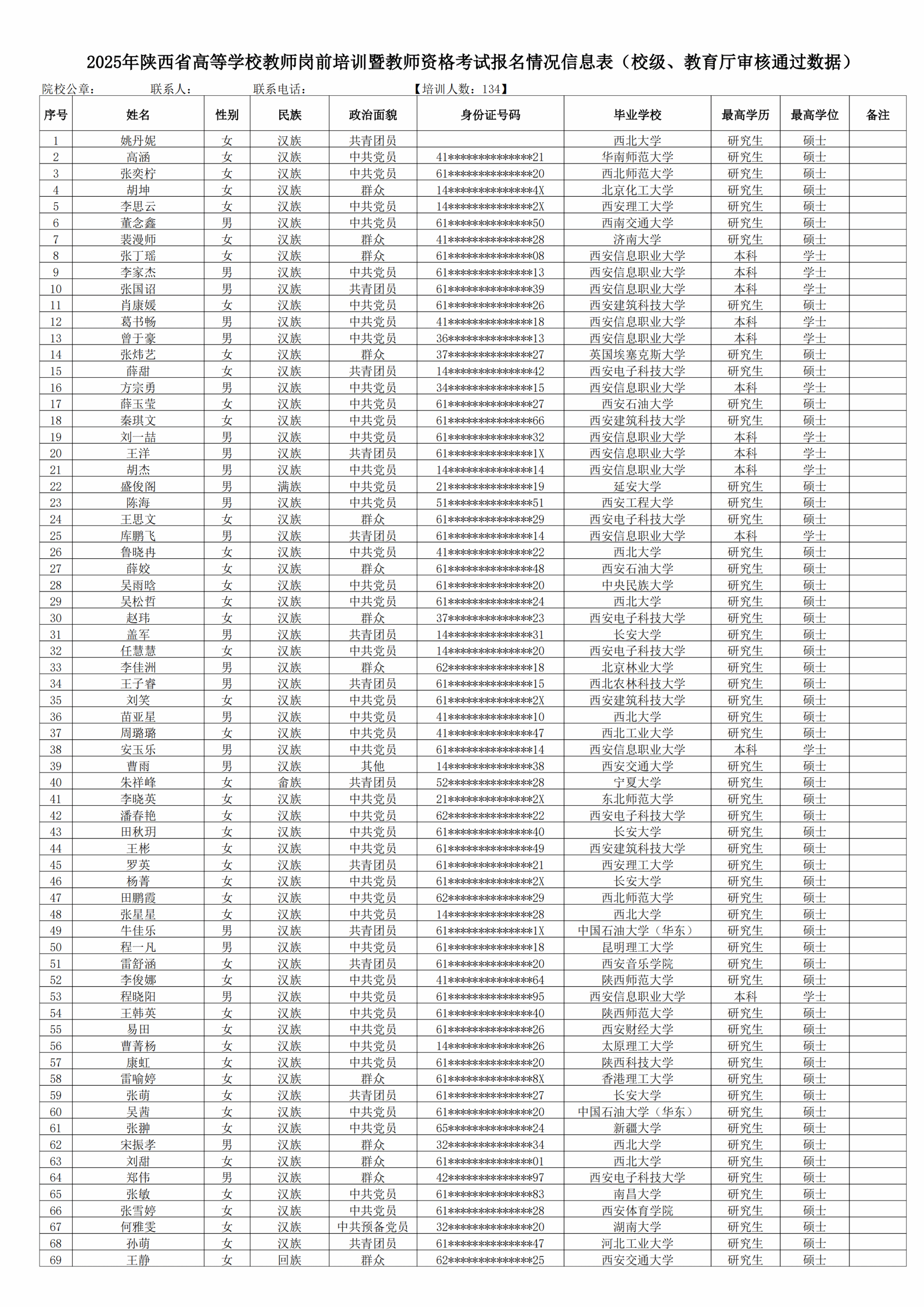 附件:2025年陕西省高校教师岗前培训暨教师资格教育基础理论知识培训报名人员公示名单