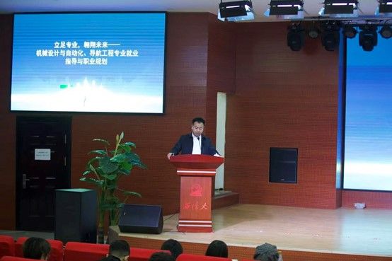 随后,杨志发院长从五个维度为同学们进行了详尽的就业指导与职业规划分析。他首先结合专业与时代机遇,指出机械设计制造及自动化专业在智能制造、高端装备等领域具有广阔前景,是推动国家从“制造大国”向“制造强国”转型的核心力量;导航工程技术则广泛应用于北斗卫星系统、无人机控制、深空探测等尖端领域,与国防安全、无人驾驶等国家战略紧密关联,技术迭代迅速、发展机遇丰富。