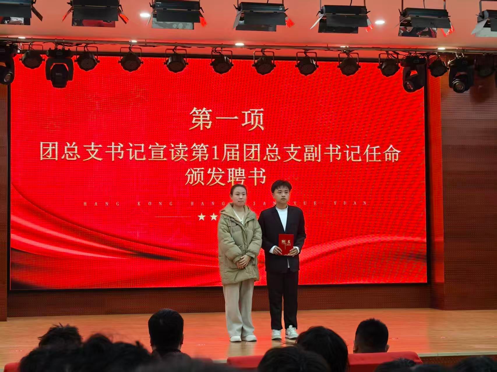随后,往届学生会主席团成员任天昊宣读了航空航天学院第一届学生会主要干部的任命名单,标志着新一届学生骨干团队正式确立。在庄重的仪式中,杨志发院长向新一届主席团授予了象征责任与传承的学院会旗,并颁发了聘书。往届主席团成员则为新成员佩戴工作牌。会旗飘扬,聘书在手,使命相传,学院服务同学、建设发展的重任正式交付于新集体。