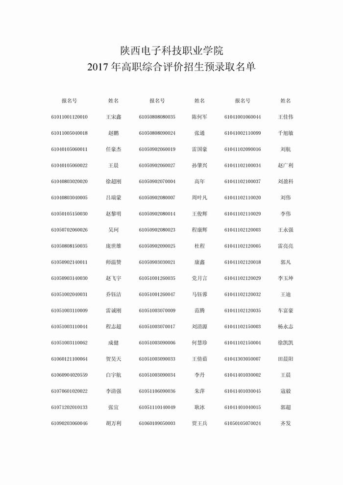 2017年高职综合评价招生预录取名单